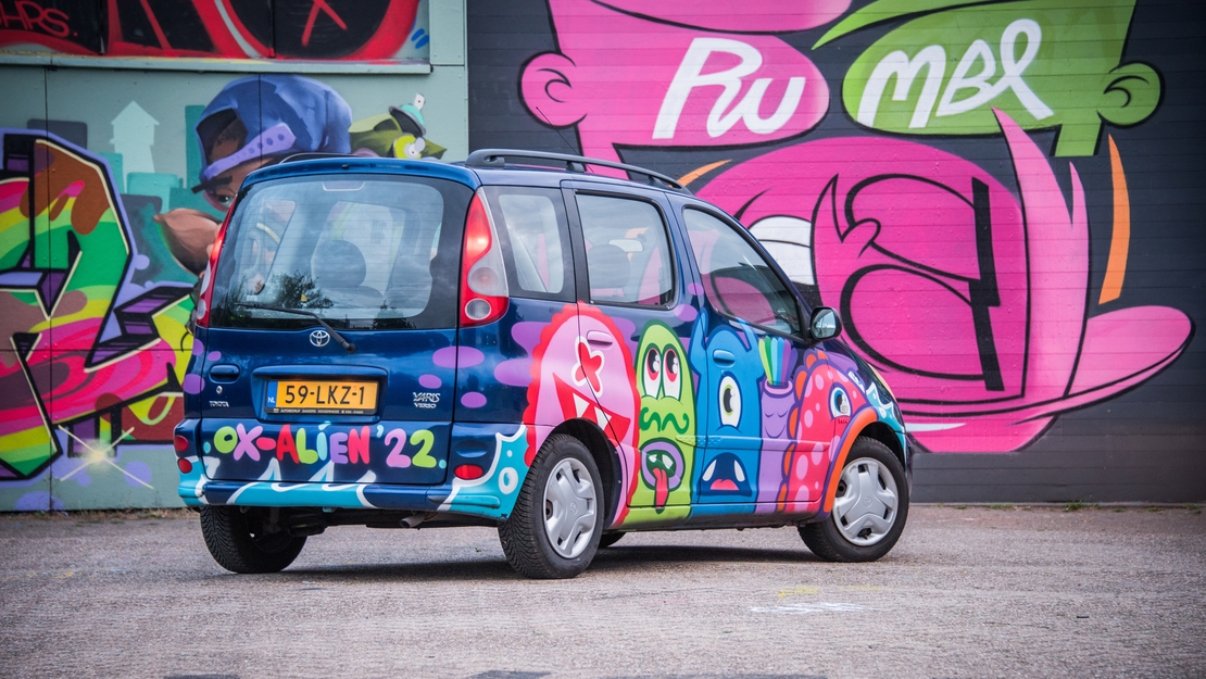 Zo blij als Elly was met haar auto, zo wreed werd dat verstoord toen in 2020 een onoplettende passant een flinke deuk in het achterportier van haar Yaris Verso reed. “Heel jammer, want ik ben altijd heel zuinig op mijn auto”, zegt Elly. “Een nieuwe deur was best prijzig. Is een auto van twintig jaar dat nog wel waard? Ik wilde eigenlijk helemaal geen andere auto.” Toen kreeg Elly ineens een idee: “Wat als ik nou eens een kunstenaar vraag om mijn auto op te pimpen, en zo die deuk te verhullen?”